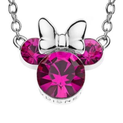 Halskette aus der Mickey Maus Kollektion, für den Monat Oktober, bezaubernde Kette für Kinder aus poliertem 925 Sterlingsilber, Rundankerkette, Stärke 1,25 mm, Länge 35 cm (+ 3 cm + 2 cm Verlängerungskettchen), Minnie Maus Anhänger mit 3 funkelnden pinken Kristallen in 2 Größen, verziert mit einer süßen silbernen Schleife, Größe 10 mm, Logo-Gravur, Federring-Verschluss mit Logoplättchen