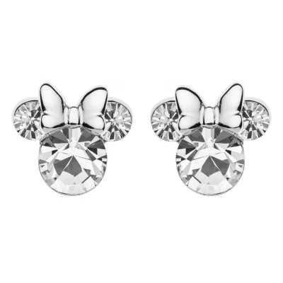 Mädchen-Ohrringe aus der Mickey Mouse Kollektion, entzückende Ohrstecker für den Monat April, aus poliertem 925 Sterling Silber, Silhouette der Minnie Maus gestaltet aus drei weißen Kristallen, verziert mit einer zarten Schleife, Größe 5 x 8 mm