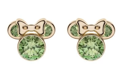 Mädchen-Ohrringe aus der Mickey Mouse Kollektion, zarte Ohrstecker für den Monat August, aus poliertem 9-karätigen Gelbgold 375, Silhouette der Minnie Maus gestaltet aus drei eingefassten grünen Kristallen, verziert mit einer zarten Schleife, Größe 5 x 8 mm
